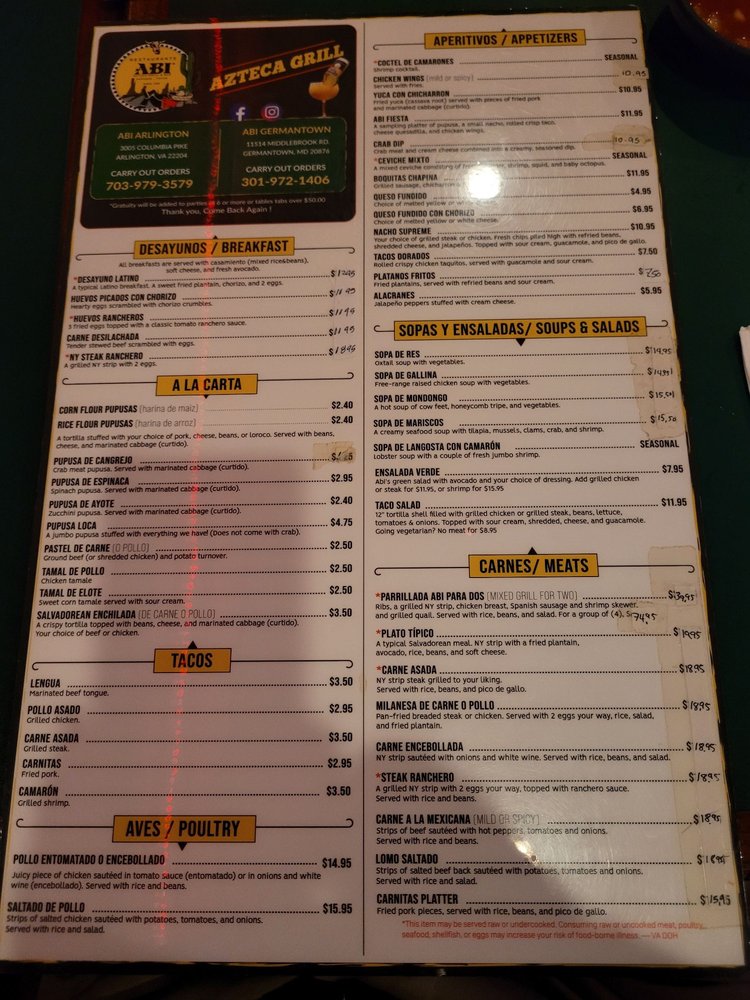 Welcome to Abi Azteca Grill & Bar, a vibrant destination in Germantown, MD, where Spanish and Mexican flavors merge to create an unforgettable dining experience. This casual eatery offers a diverse menu featuring standout dishes like Carne Asada and Sopa de Mariscos, perfect for a hearty lunch or a cozy dinner.